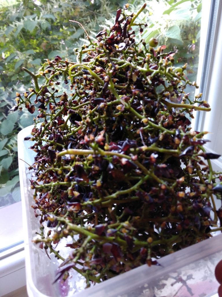 Believe it or not, we kept finding more grapes peeking out on the vine! For the last harvest I recruited Zbyszek and his ladder for the hard-to-get grapes, while I mournfully greeted the shriveling vine on the balcony for the third time. We got smarter and started picking after a rain shower to eliminate the presence of bees, who lately were going craaazy over the near-raisins in the sun.