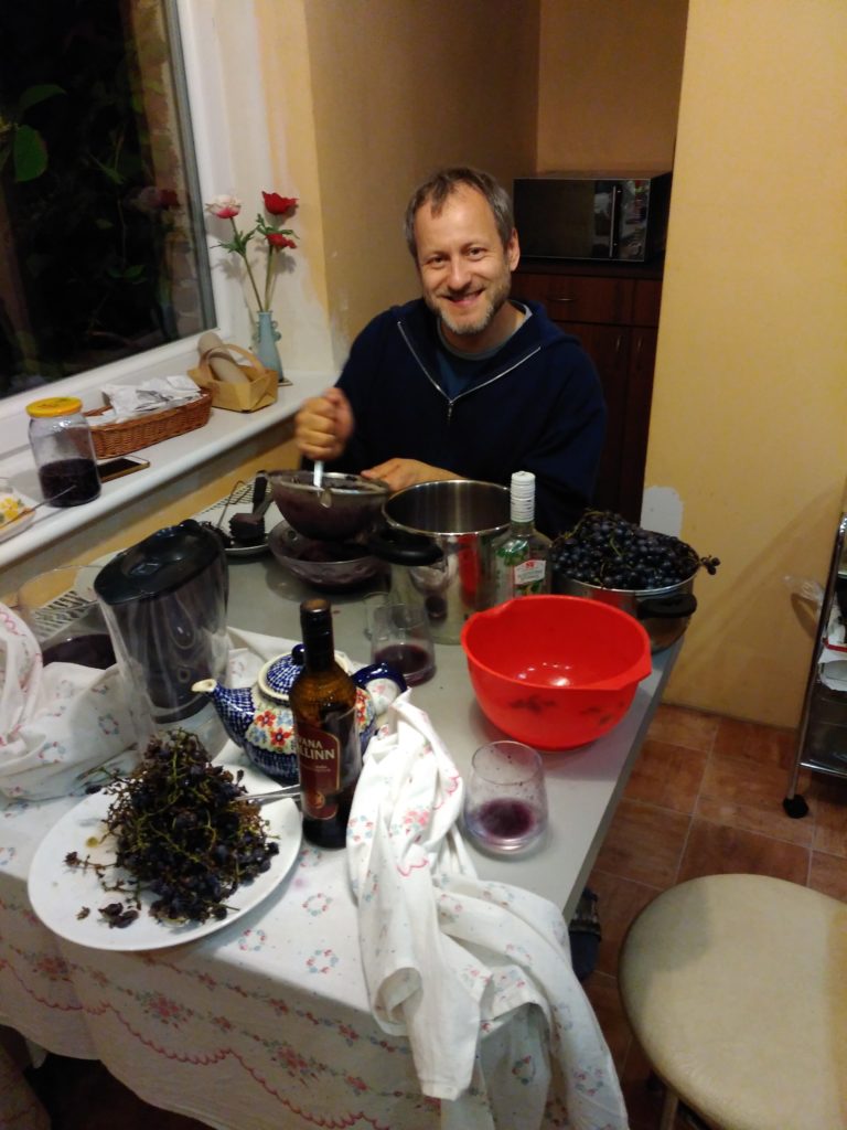 One of the things I did not associate with coming to Poland was wine. Vodka, beer, mead, liquors ranging from sweet and fruity to harsh and fire-breathing, yes. But little did I know that Poland produces small but hearty batches of wine to rival the best vino of her more clemently-climated neighbors. And even little-er did I know that Zbyszek’s penchant for experiments would lead us to our wine making operations. But when your balcony groans with the weight of deeply plump purple grapes, what else are you going to do?