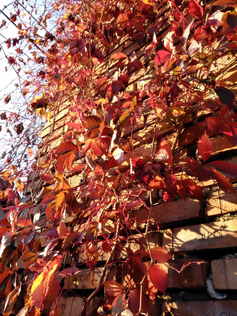 Now, in mid-November, our own grape vine is brown and dry. Its glorious leaves and sweet burden have been plucked or ravaged by the cold. But we have the memory of our grand grape project, and the homemade wine still gives out an occasional gurgle.