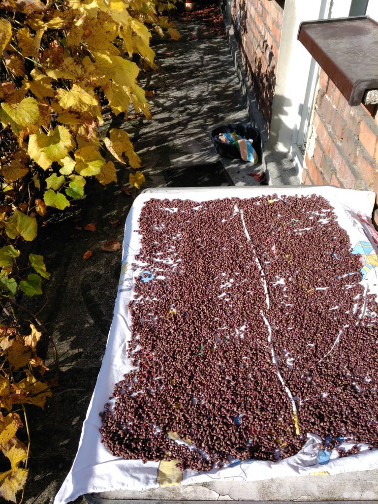 Zbyszek does not like to waste, so we dried out the seeds in the sun, and now have two containers of dried grape seeds in the pantry that aspire to become grape seed oil someday.